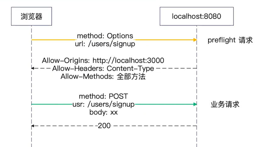 解决办法:preflight机制。(即告诉浏览器可以接收到从A过来的请求);发到同一个地址上,使用Options方法,没有请求参数。